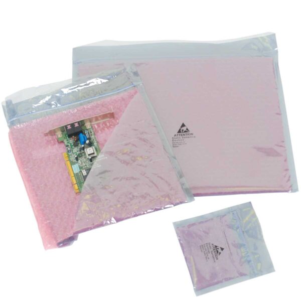 שקיות שילדינג עם פס סגירה ובתוכה שקית בועות אנטי סטטית תלת שכבתית, מחוברות יחדיו מתחת לפס ההלחמה.