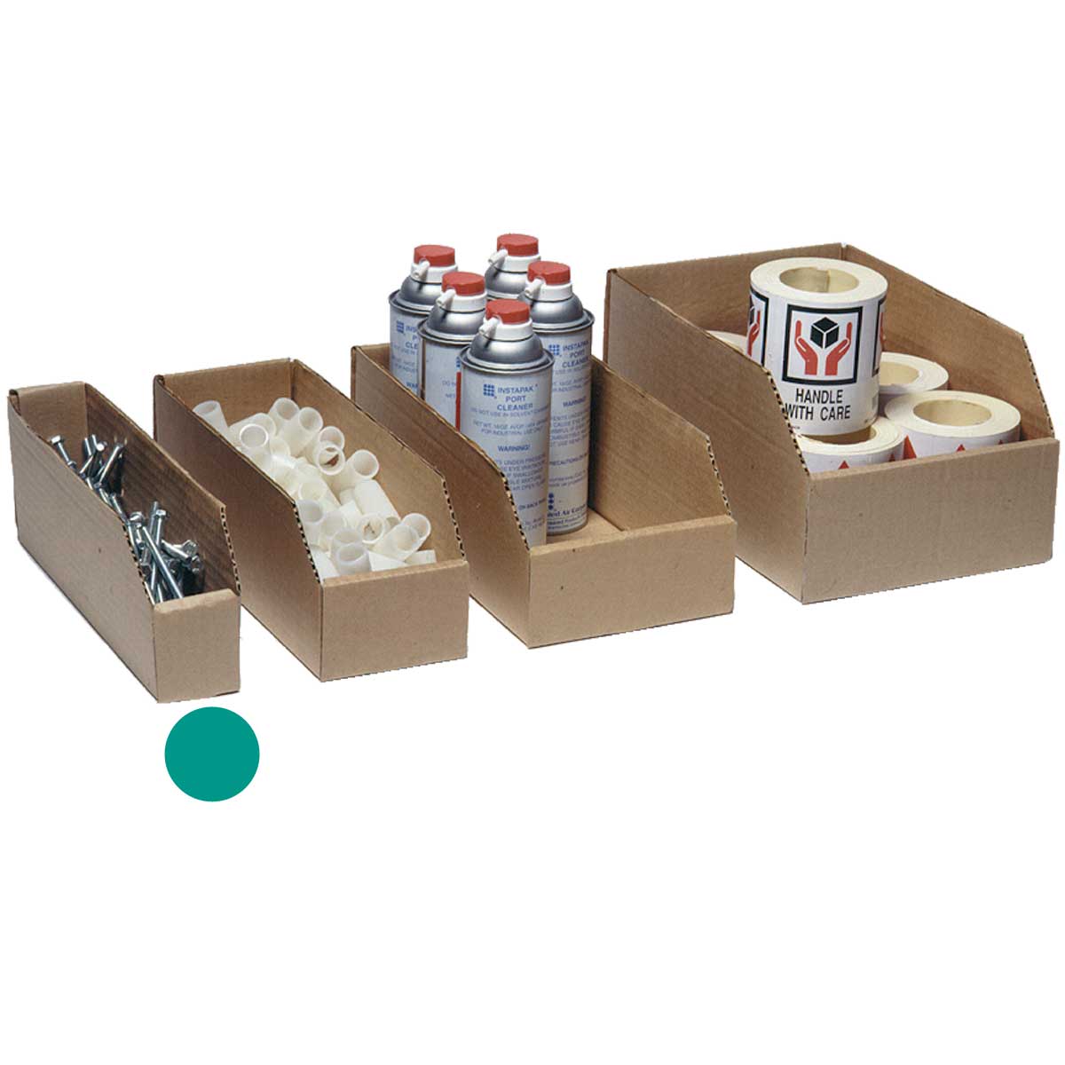 מגירות קרטון לאחסון מסודר על מדפי המחסן.